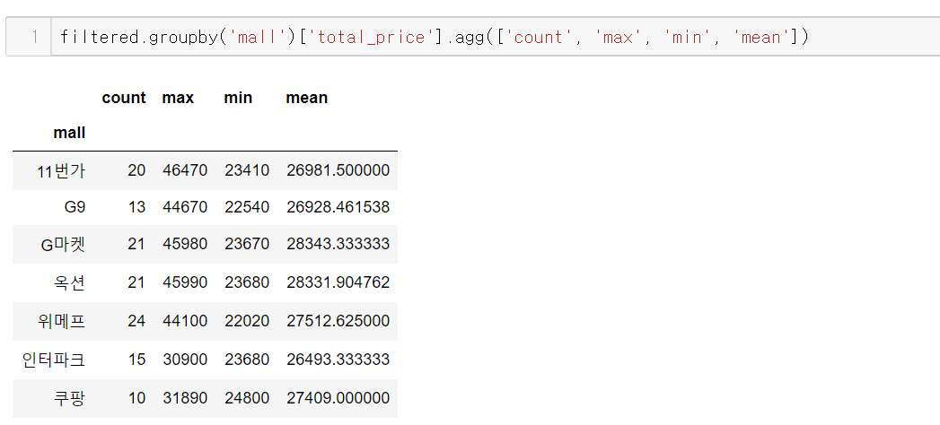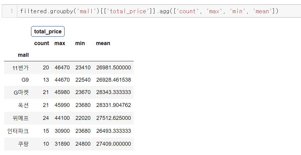 이를 mall별로 그룹화하여 total_price의 count, max, min, mean을 찾아보자