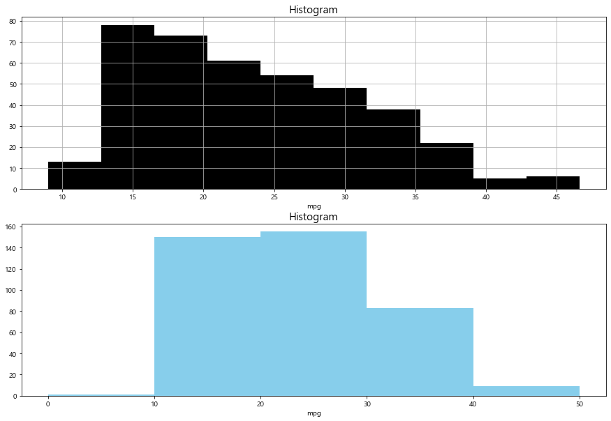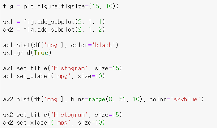 위 검정 히스토그램은 아무 옵션 없이 그렸을 때의 그림이다.