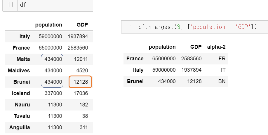 인구를 먼저 내림차순 한 뒤 GDP 컬럼에서 높은 순을 찾아 보여준다.