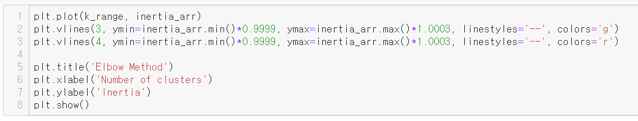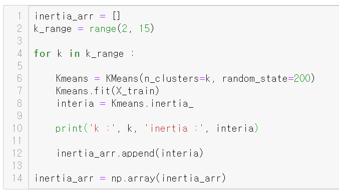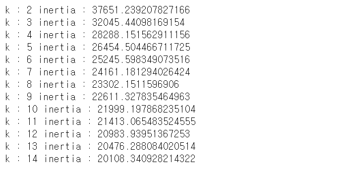 Cluster 간의 거리의 합을 나타내는 inertia가 급격히 떨어지는 구간이 생기는데