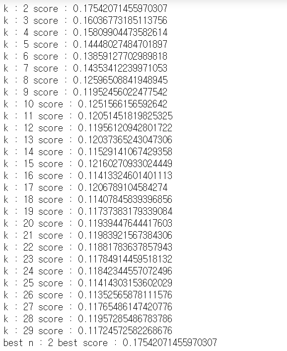 2개부터 10개까지 나눠봤으며, 보는 바와 같이 군집이 적을 수록 점수가 높은 경향이 있다.