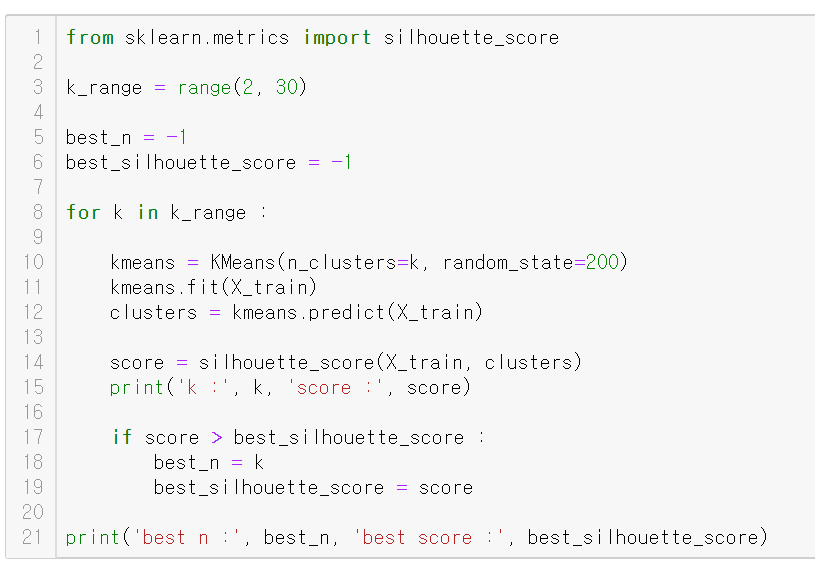 군집타당성지표인 실루엣 점수를 이용한다.