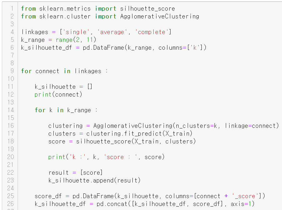 연결기준과 군집의 개수에 따라 실루엣 점수를 측정했다.